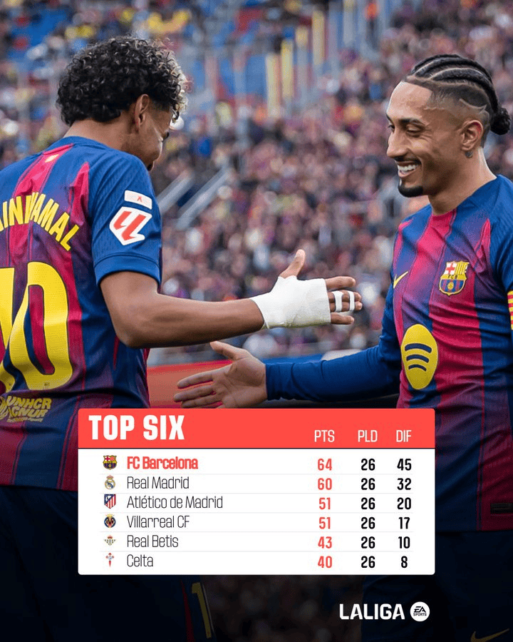比利亚雷亚尔26轮拿到16胜3平7负,同样收获51分排名第四名。贝蒂斯26轮11胜10平5负,拿到43分,排名第五名。